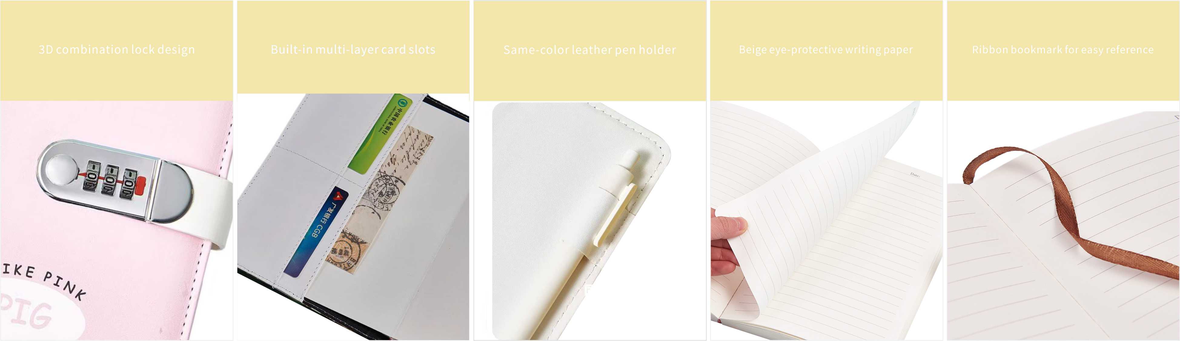 Nhật ký này với khóa mật khẩu cung cấp một loạt các mẫu bìa dễ thương. Bất kể bạn thích phong cách nào, bạn có thể tìm thấy sự lựa chọn yêu thích của bạn ở đây. Nó cũng được trang bị khóa mật khẩu kim loại chắc chắn và bền. Bạn có thể tự đặt một mật khẩu duy nhất để đảm bảo rằng chỉ có bạn mới có thể mở nó và đọc trang bên trong, cung cấp sự bảo vệ đáng tin cậy cho quyền riêng tư và thông tin quan trọng của bạn. Để làm cho bạn thuận tiện để ghi lại ý tưởng của mình bất cứ lúc nào, nhật ký của chúng tôi cũng chu đáo thiết lập một vị trí bút. Nó có thể giữ bút đều đặn, để bạn có thể lấy một kỷ lục bút bất cứ lúc nào khi bạn cần. Một tính năng nổi bật khác là chức năng túi bên trong của nó. Nhật ký này với khóa mật khẩu được trang bị nhiều ổ cắm thẻ và túi bên trong, cho phép bạn lưu trữ gọn gàng thẻ ngân hàng, thẻ ID, thẻ thành viên, biên lai và các mặt hàng khác, và bạn không còn phải lo lắng về việc mất các mặt hàng quan trọng này.
